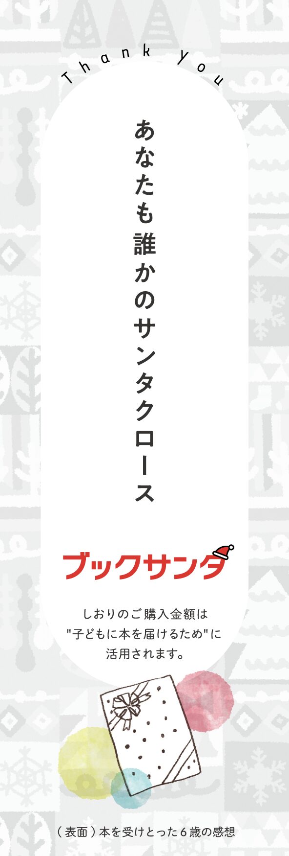 「書店で誰でもサンタになれる(プレゼントを贈れる)」を合言葉に、「秋〜クリスマスには、誰かのために本を贈る」という、チャリティムーブメントを皆さまと一緒につくっていきたいと願っています。